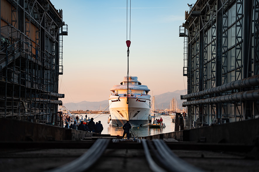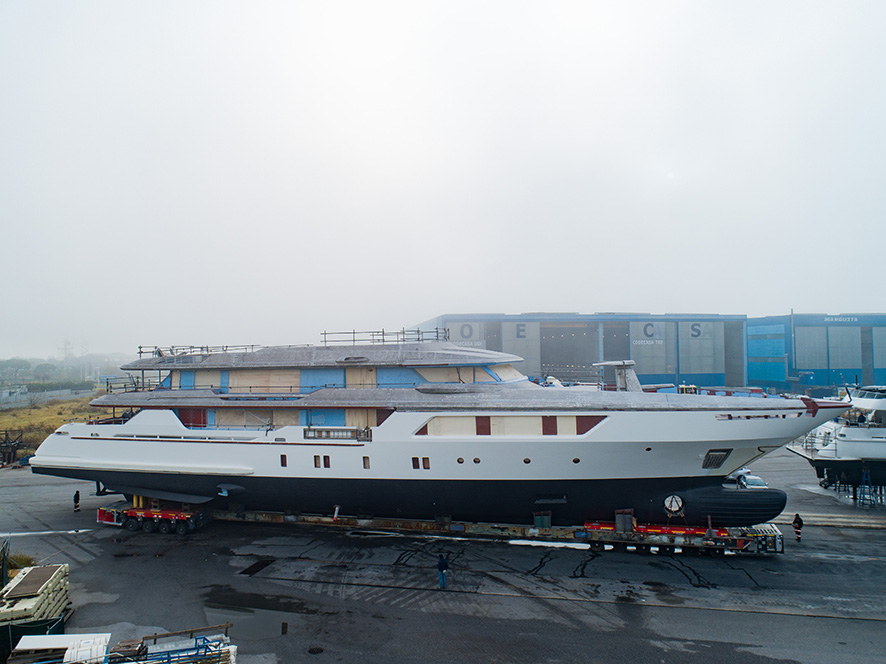Yacht con scafo in acciaio e sovrastruttura in alluminio, spinto da due motori Caterpillar 3512E (1771 kW/2375 hp @ 1800 rpm), con i suoi 57metri potrà arrivare a una velocità massima di 17 nodi a dislocamento leggero e un’autonomia di 5000 miglia @ 12 nodi.