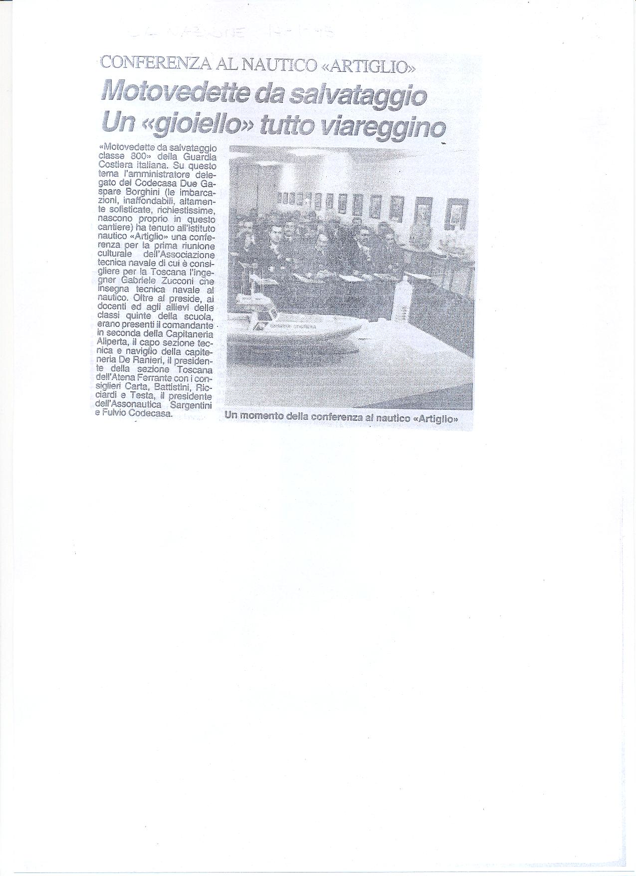 “Motovedette da salvataggio classe 800” della Guardia Costiera italiana. Su questa tema l’amministratore delegato del Codecasa Due Gaspare Borghini (le imbarcazioni, inaffondabili, altamente sofisticate, richiestissime, nascono proprio in questo cantiere) ha tenuto all’istituto nautico “Artiglio” una conferenza per la prima riunione culturale dell’Associazione tecnica navale di cui è consigliere per la Toscana l’ingegner Gabriele Zucconi che insegna tecnica navale al nautico.
