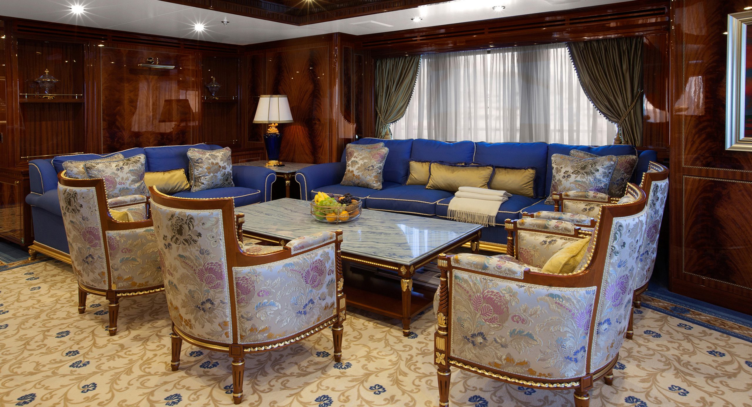 Per il primo 50 mt della Serie Vintage, il m.y. Gazzella, è stato scelto dall’Armatore il colore bianco sia per lo scafo sia per la sovrastruttura. Le linee esterne pulite e tradizionali sono a contrasto con interni classici e sfarzosi. Appena entrati, l’attenzione viene subito catturata dalla ricchezza degli interni, che in tutto lo Yacht sono realizzati in mogano e piuma di mogano, con pavimentazioni che alternano, a seconda delle zone, pregiati marmi e onici a moquettes dalle eleganti decorazioni. Il salone principale è composto da un’ampia zona conversazione costituita da due ampi divani, quattro poltrone dai colori rosso e oro, disposti attorno ad un tavolo da fumo in mogano con inserti in oro e davanti ad un TV 65”.